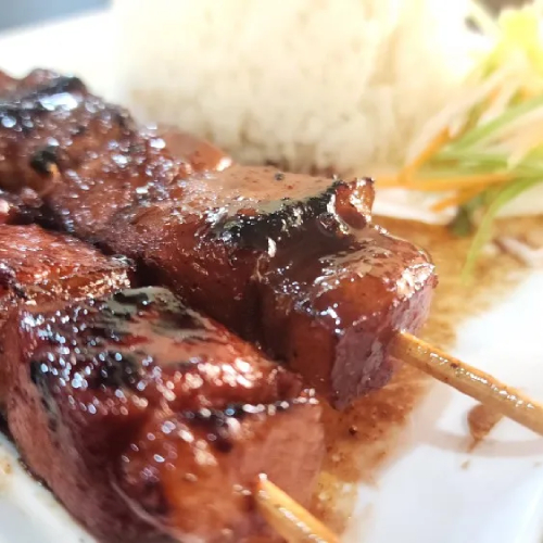 Sink your teeth into two juicy, tender pork barbecue sticks, grilled to smoky perfection and glazed with our signature sweet-savory sauce. Served with a generous scoop of steaming white rice perfect for soaking up every flavorful bite. A simple yet satisfying classic that hits all the right spots.