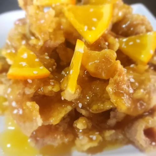 Orange Chicken – Crispy, golden-brown chicken coated in a sweet and tangy orange glaze, with real orange bits for a burst of citrus flavor. Garnished with sesame seeds for an extra crunch.