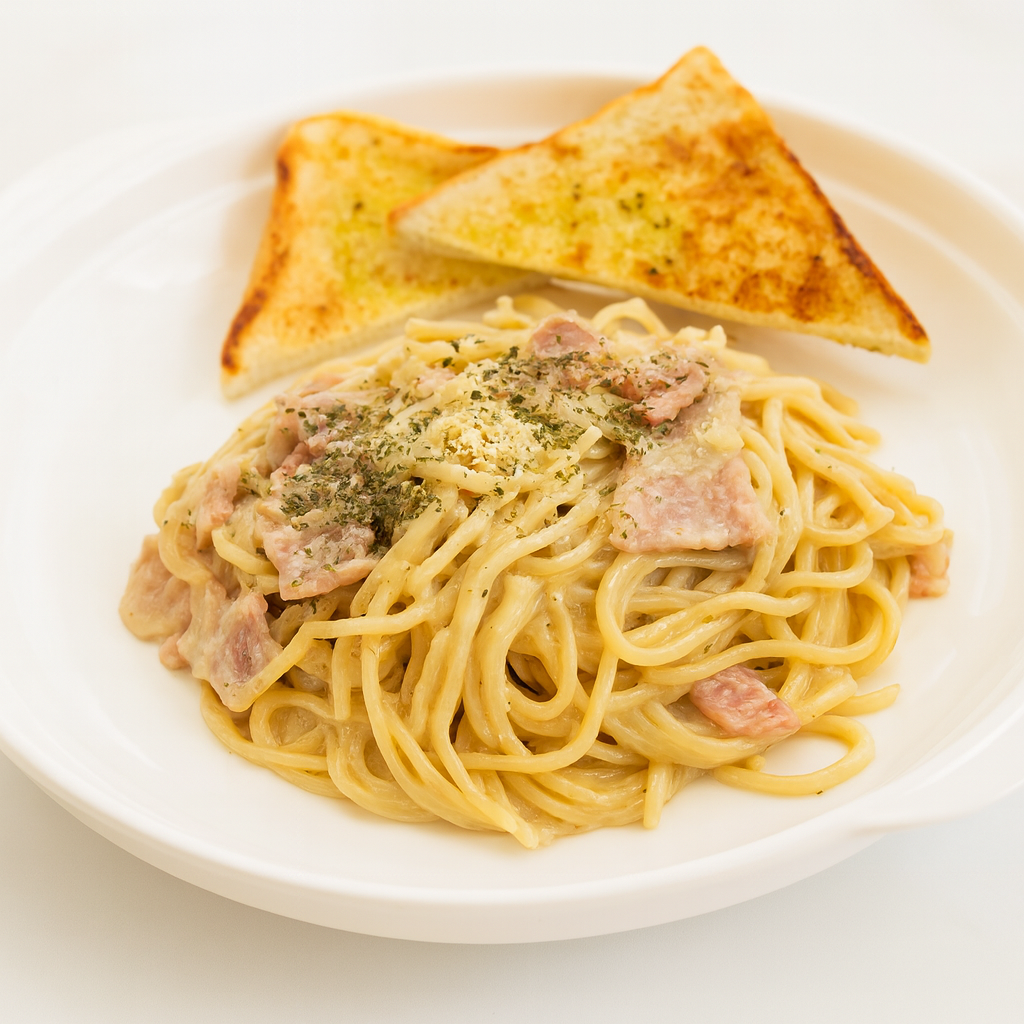 200 grams of spaghetti pasta, milk, cream, garlic, ham, bacon, parmesan cheese and garlic bread