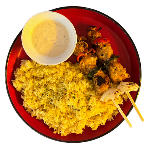 Grilled bell pepper, onion, and chicken marinated in seasoned yogurt served with sauce, rice, and lemon on the side.