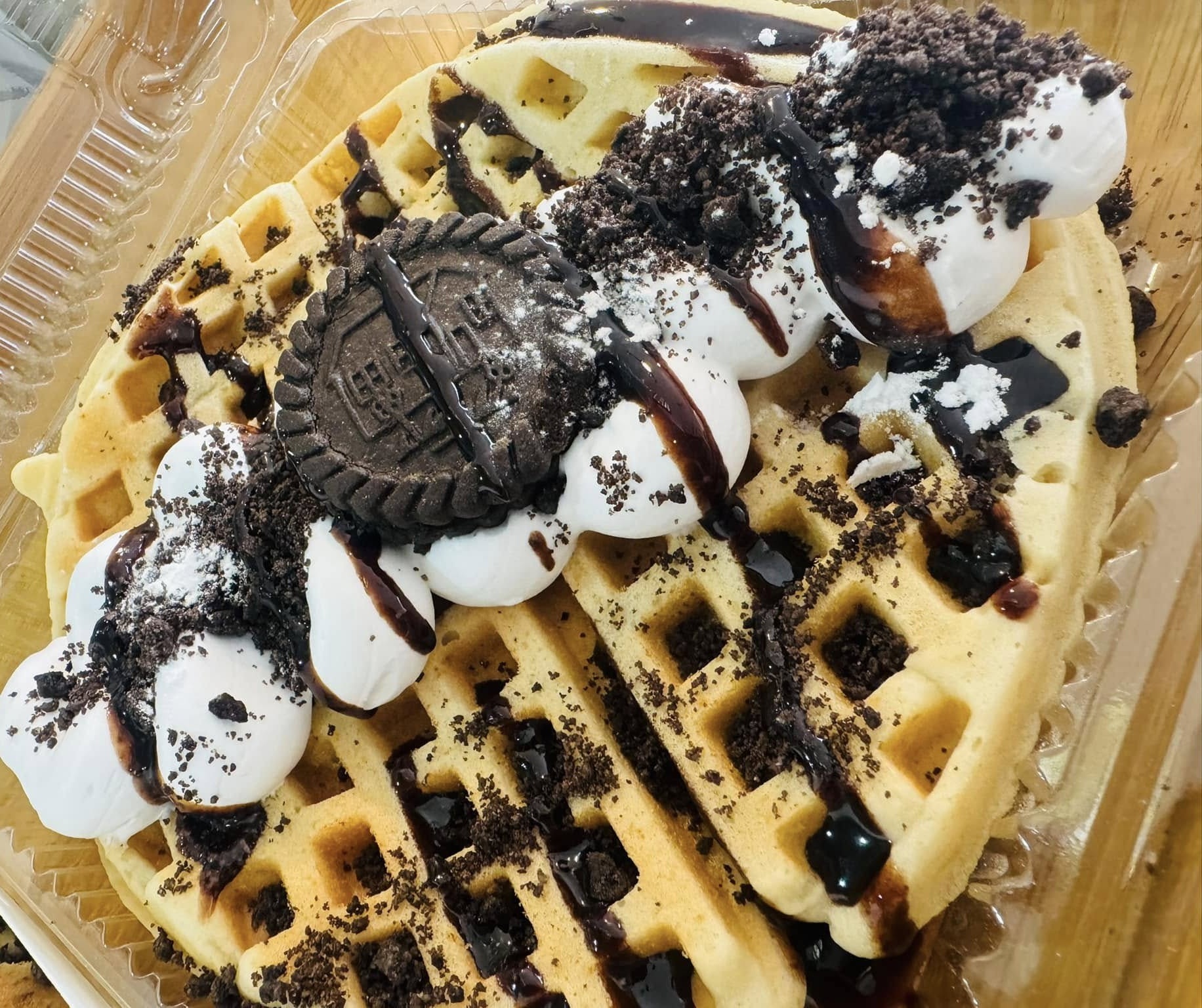 Indulge in our delightful Cookies and Cream Waffle, a fluffy treat infused with the iconic flavors of crushed OREO cookies.
