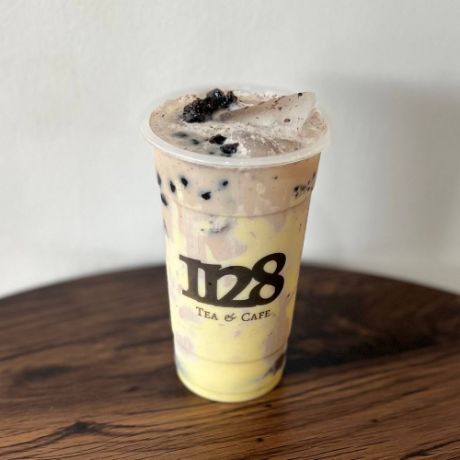 Black tea + creamer+ 1128's housemade creamcheese + crushed oreos cookies + soft chewy black pearls. 22oz of Oreo goodness.