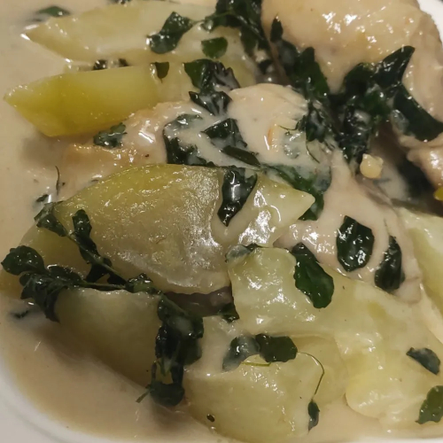 Filipino delight. Tender chicken simmered in creamy coconut milk, mingling with papaya slices. Enhanced with aromatic spices, this dish offers a harmonious blend of sweetness and warmth. A comforting culinary experience in every spoonful.(We can't accommodate requests for specific meat parts.)