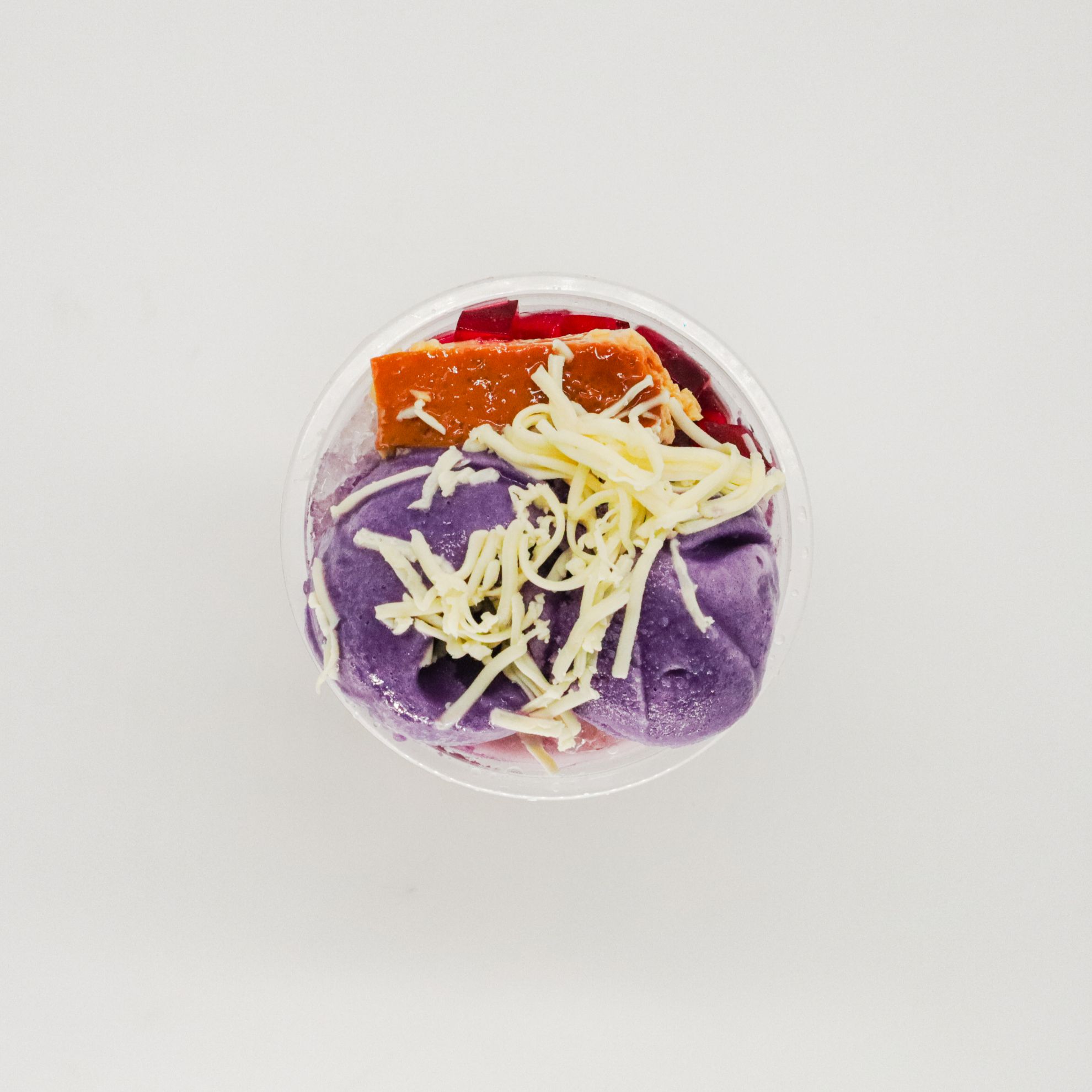 Indulge in a delightful mix of shaved ice, sweet beans, tropical fruits, and creamy leche flan!