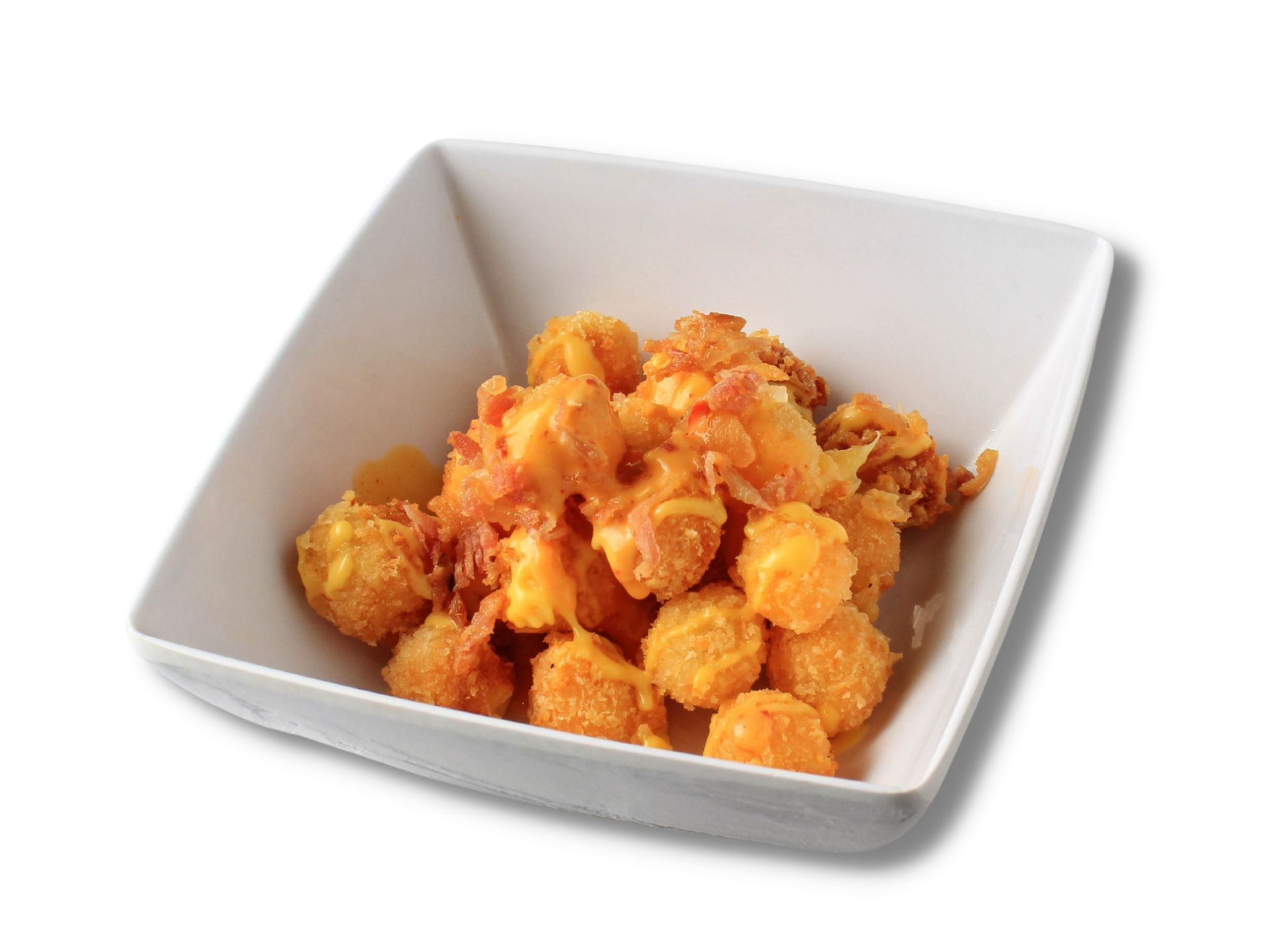 Cheese balls covered with thick layer of our special kimcheese sauce topped with bacon bits.