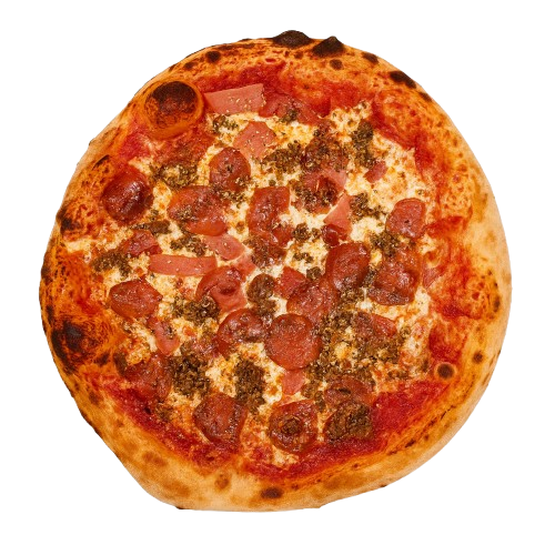 Satisfy your cravings with our Meat Overload Pizza, packed with generous servings of pepperoni, ham, bacon, ground beef, and sausage. Every slice is bursting with rich, savory flavors, perfectly balanced with gooey mozzarella on a crisp, golden-baked crust. The ultimate treat for true meat lovers!