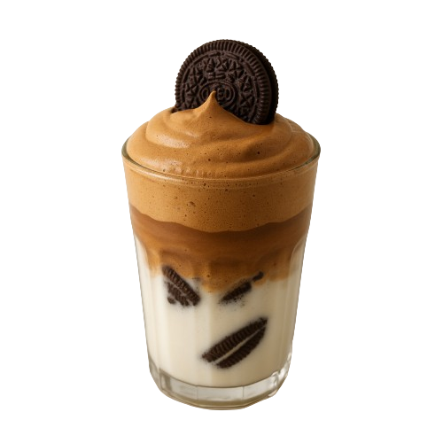 A sweet, whipped coffee drink into a thick, foamy texture, then dolloping it onto cold milk with real Oreo cookies