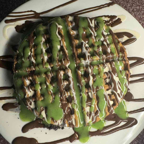A golden waffle topped with creamy Nutella and crunchy pistachios.