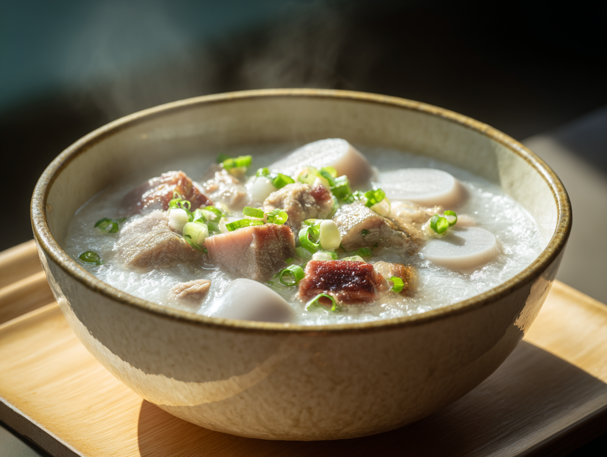 Silky-smooth and deeply comforting, this pork taro congee is slow-simmered until the rice breaks down into a luscious, velvety porridge. Tender pork adds savory richness, while soft cubes of taro lend a gentle sweetness and creamy texture that melts into every spoonful. Finished with slices of century egg, the congee gains a distinct depth of flavor—earthy, umami-rich, and beautifully aromatic. Warm, nourishing, and satisfying, this classic bowl is both hearty and soothing, perfect for a light meal or a comforting start to the day. 🍲✨ Servings:  Solo.