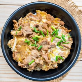 Tender slices of chashu pork glazed with savory-sweet teriyaki sauce, served over steamed rice and topped with fresh green onions and a soft-boiled egg. A perfect harmony of rich flavors and comforting textures.