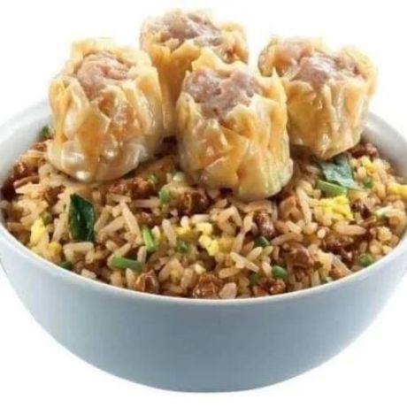 Juicy shrimp siomai atop savory fried rice.