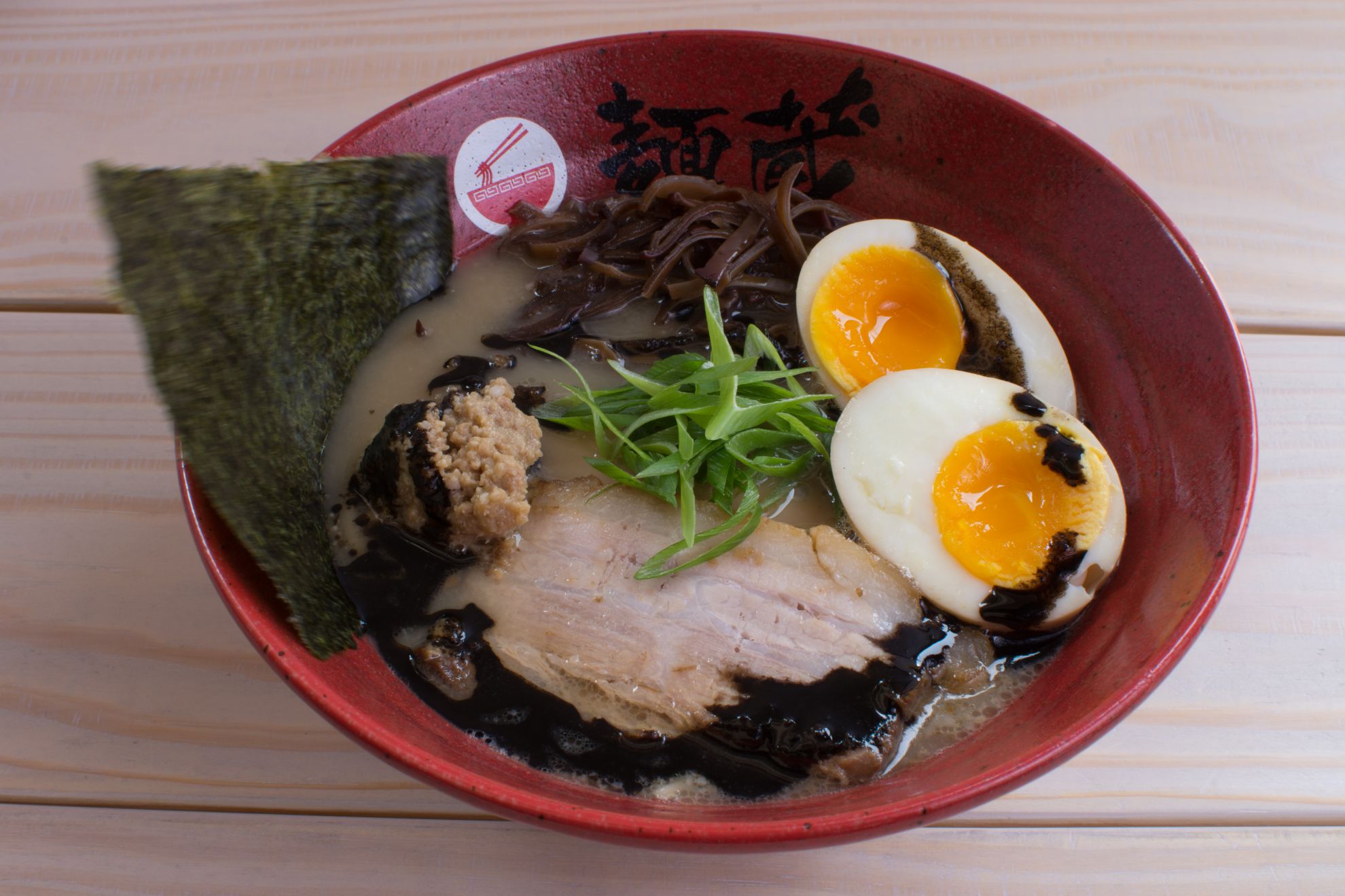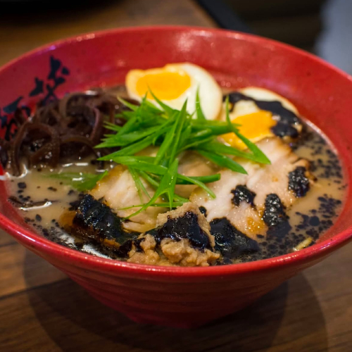 A bold and aromatic take on our tonkotsu classic, enriched with house-made black garlic oil (mayu). This premium bowl features tender pork belly, roasted nori, shiro tama (quail egg), and ajitama (seasoned soft-boiled egg), layered over creamy pork bone broth and thin noodles. Deep, garlicky, and unforgettable