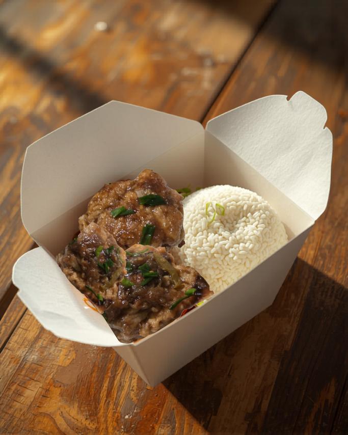 Sweet and spicy chicken rice meal with 8oz fruit juice
