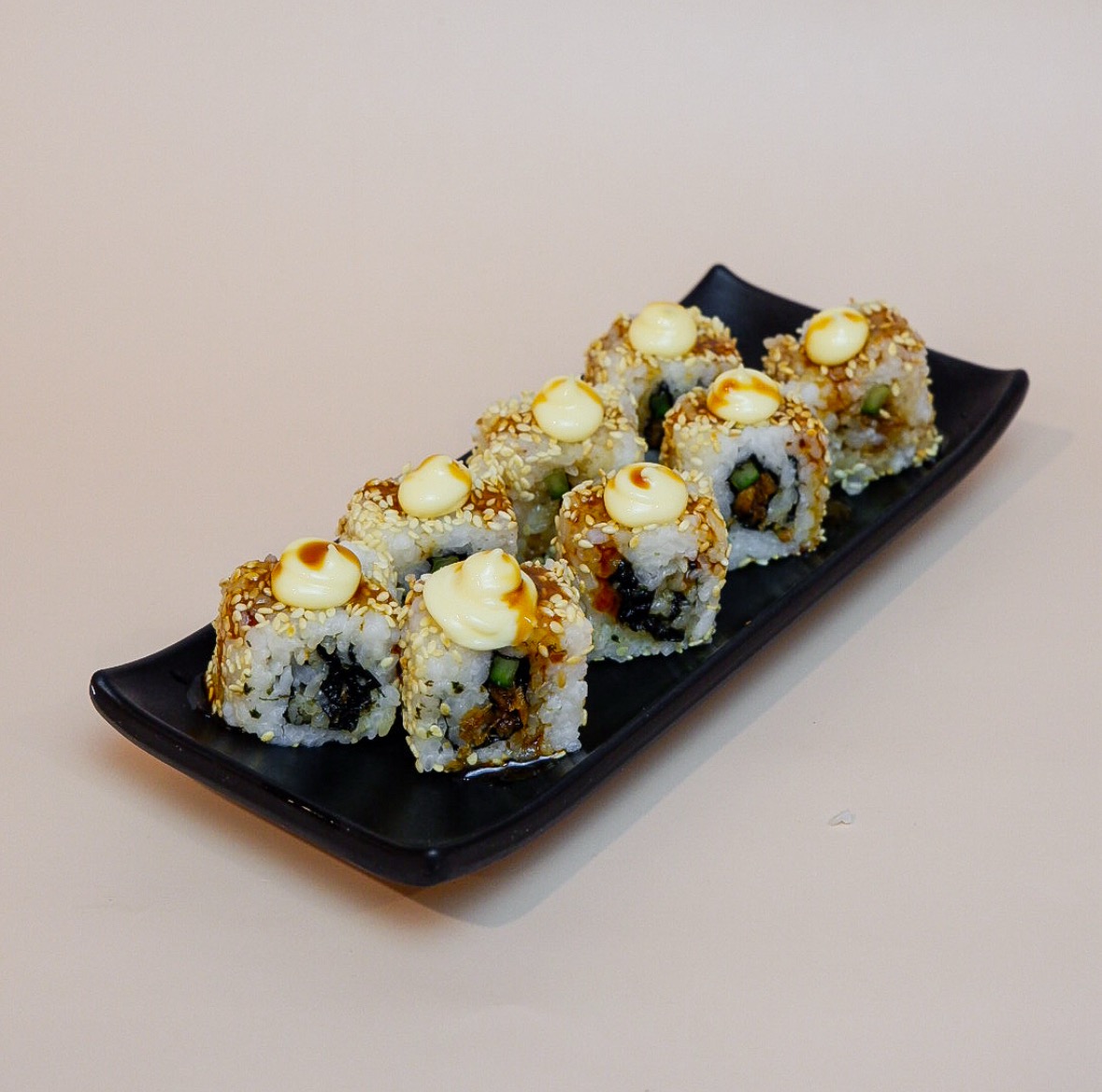Savory teriyaki-glazed pork with sushi rice, cucumber, wrapped in nori. A delicious fusion of sweet and umami flavors in every bite