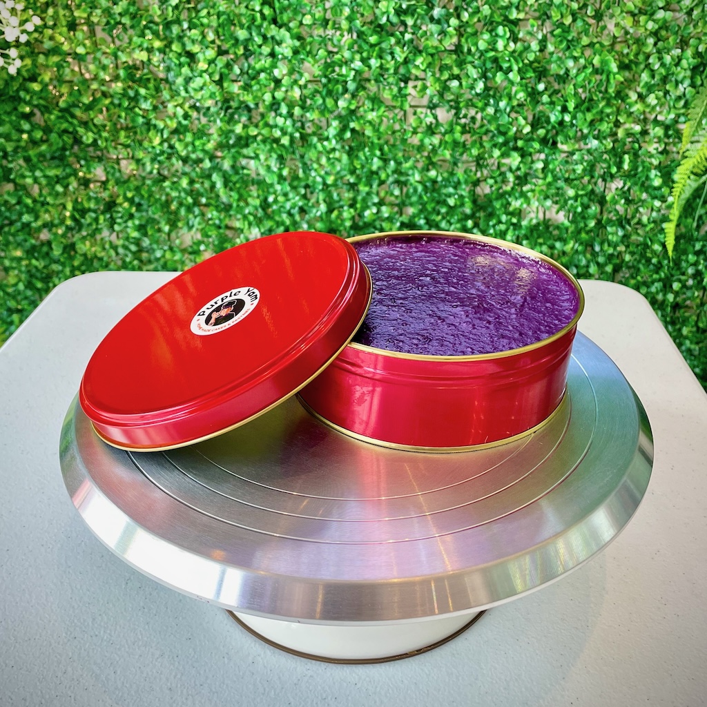 Ube Cake in Tincan Round - soft ube chiffon cake topped with pure ube halaya frosting, packaged in travel-friendly 6"-dia round tin can; great for gifting!