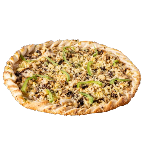 Enter the taste buds of the chef of a new form of pizza with a twist of white sauce found only at Chef Arnold. Roasted chicken, roasted garlic, mushroom, bell pepper, and cheese.