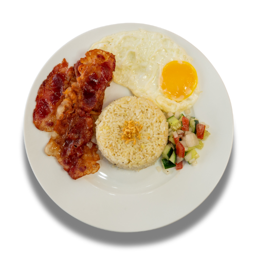 Crispy bacon and fried egg served with rice for a classic comfort meal.