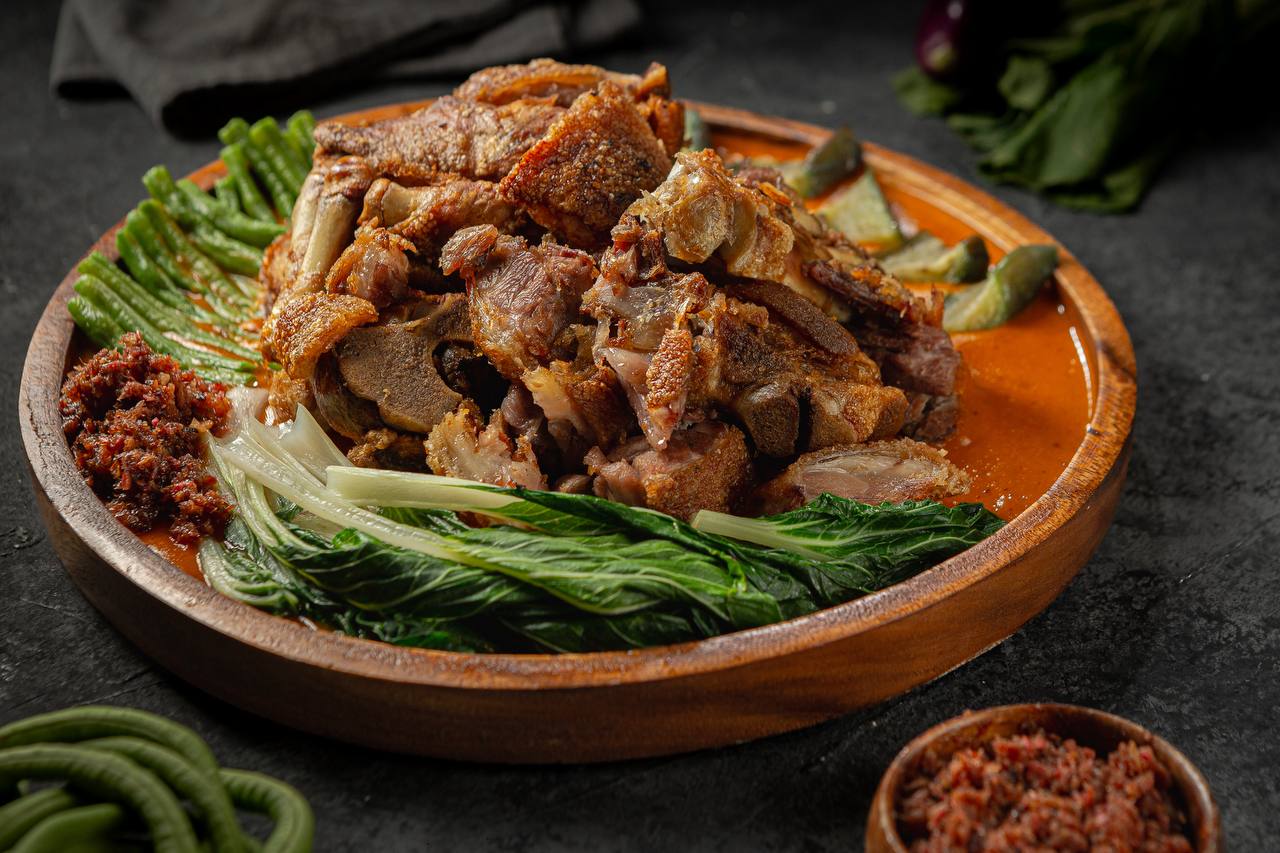 Crispy Pata Kare-Kare (For Sharing) is a festive and flavorful Filipino dish made to serve groups. Featuring a whole crispy pork leg that's tender on the inside and perfectly crunchy on the outside, this dish is smothered in rich, house-made peanut kare-kare sauce and served with a medley of native vegetables like string beans, eggplant, and banana heart. Paired with steamed rice and classic bagoong (fermented shrimp paste), it’s the ultimate centerpiece for family gatherings, special occasions, or group feasts. Ideal for 3–5 people, depending on appetite.