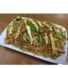 Garnished with sauteed Ring Onions and Mixed Vegetables, Served with rice and Homemade Pickles.