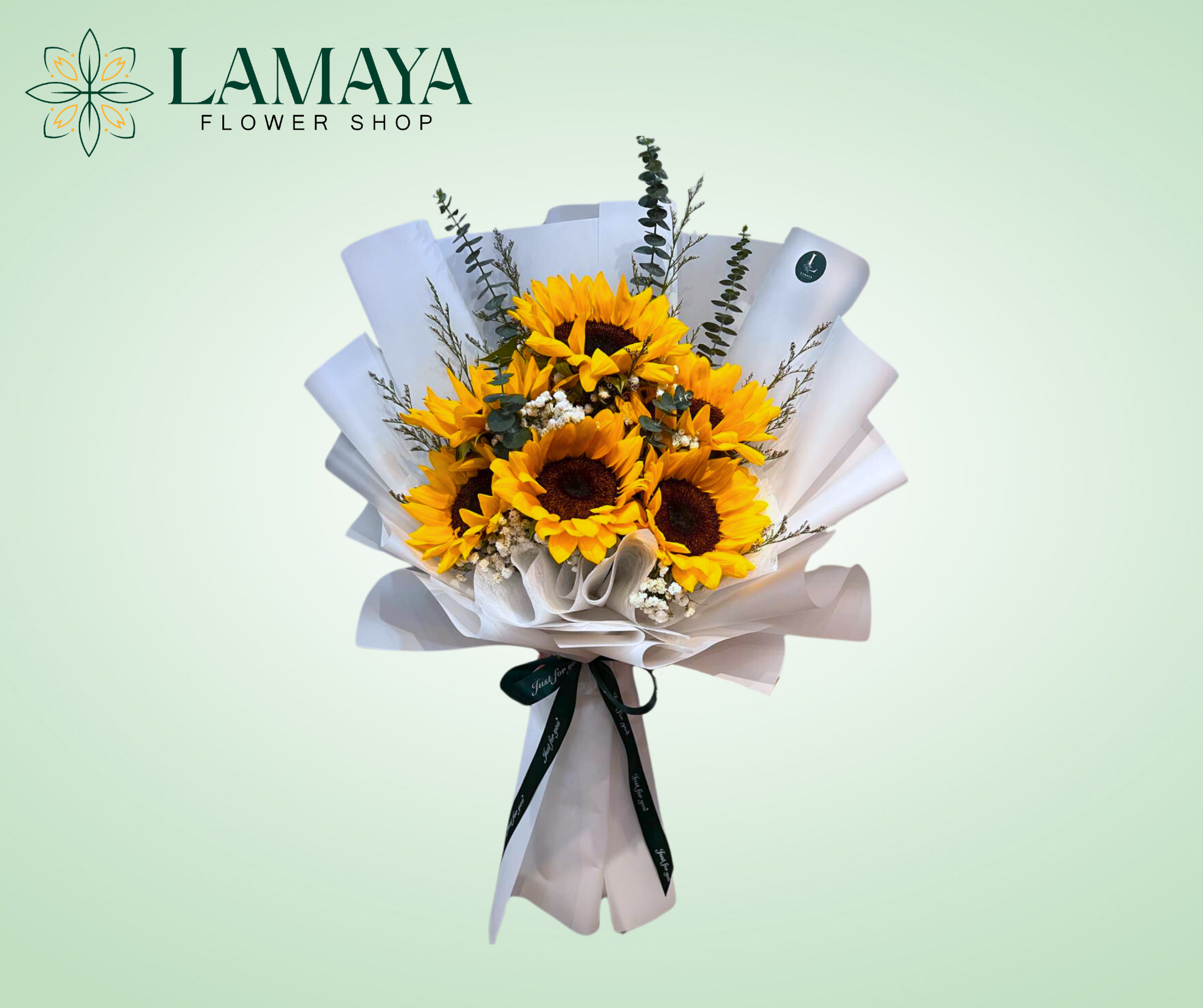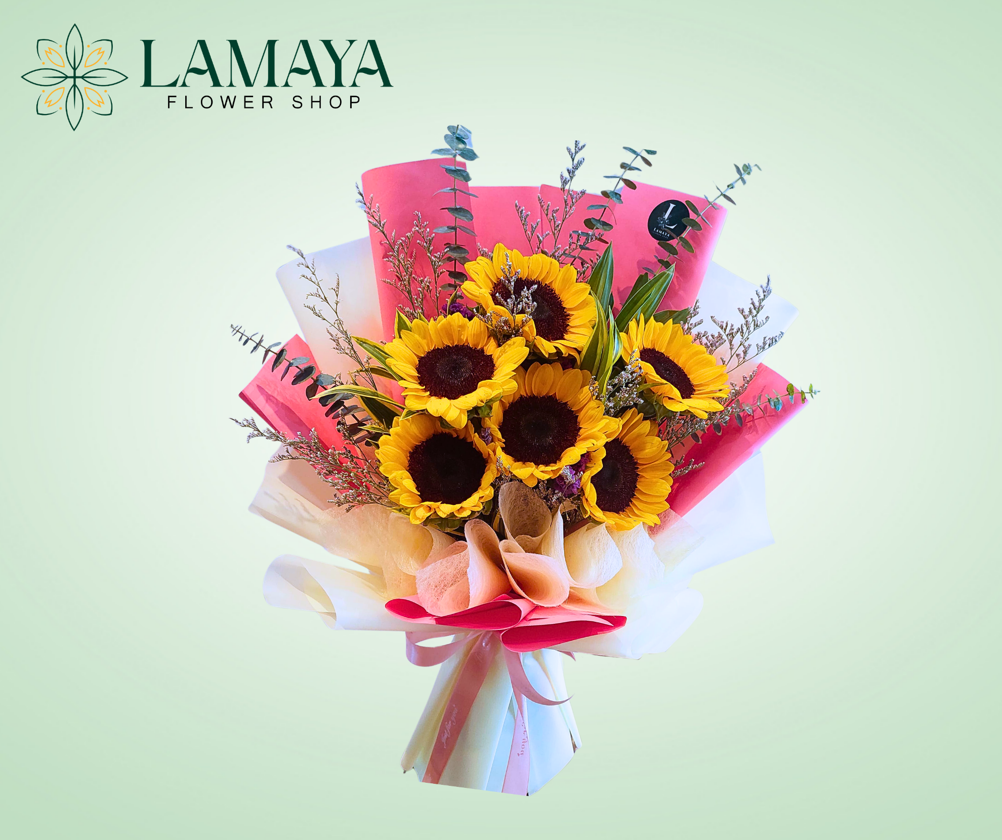 Six vibrant sunflowers gathered into a delightful arrangement, perfect for making someone smile on any occasion.