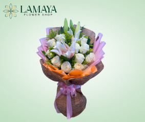 Featuring the timeless beauty of lilies, accentuated with lush greenery and delicate fillers. This bouquet exudes elegance and grace, making it the perfect choice for celebrating milestones, expressing sympathy, or simply brightening someone’s day.
