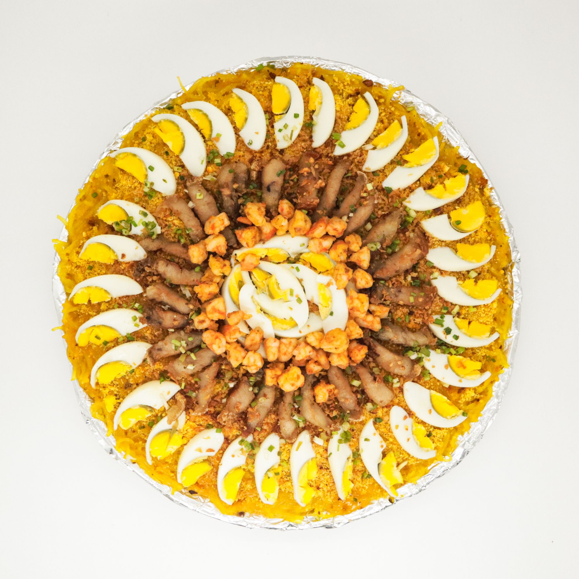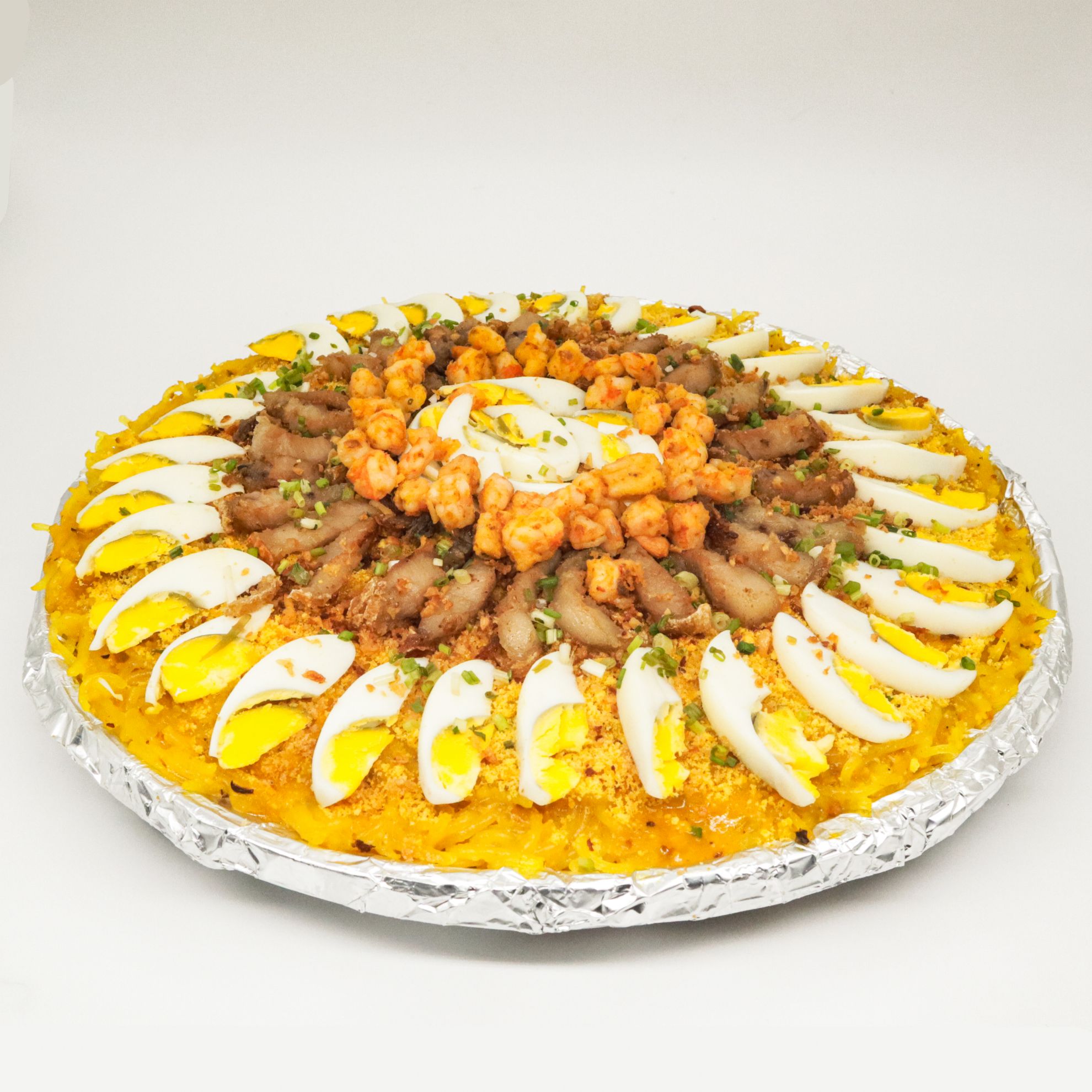 Flavorful palabok with shrimp, squid, eggs, and chicharon.