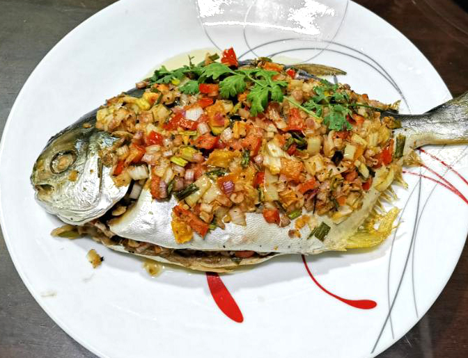 Whole pompano fish, expertly slashed and packed with aromatic spices, then deep-fried to shimmering gold.