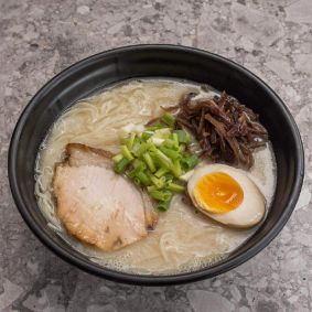 A bold and aromatic take on our tonkotsu classic, enriched with house-made black garlic oil (mayu). This premium bowl features tender pork belly, roasted nori, shiro tama (quail egg), and ajitama (seasoned soft-boiled egg), layered over creamy pork bone broth and thin noodles. Deep, garlicky, and unforgettable