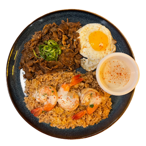 Combination of beef & shrimp served with steak rice.