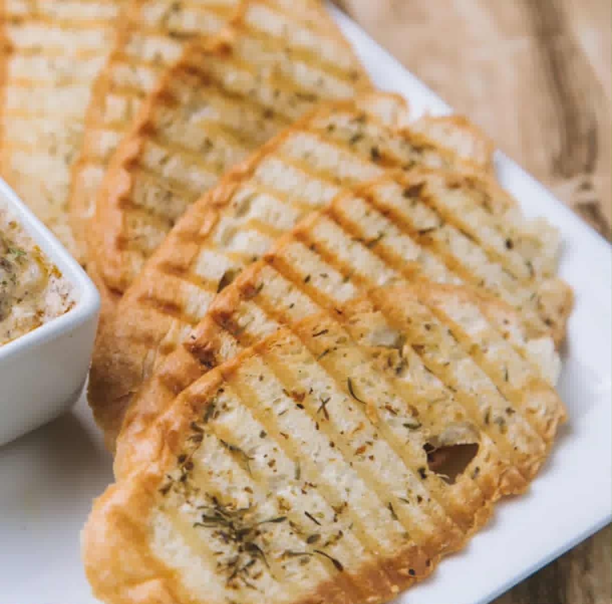 Savor toasted herbed bread with a crispy crust and aromatic herbs—perfectly toasted for a flavorful bite.
