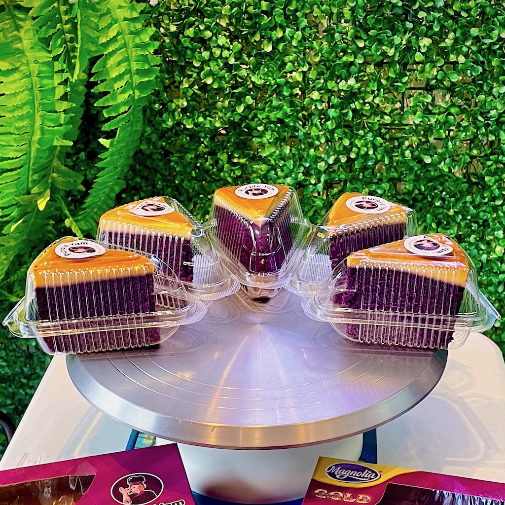 Individually packed single slices of ube cake topped with perfectly sweet and creamy custard layer. Excellent to-go cakes!